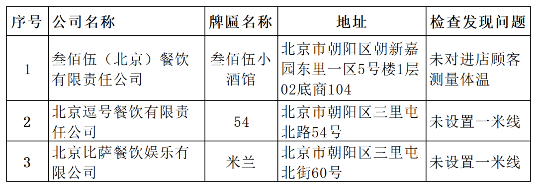 2021年1月1日至1月2日,北京市朝陽區(qū)市場監(jiān)督管理局對酒吧類企業(yè)疫情防控檢查發(fā)現(xiàn)問題的3家企業(yè)進(jìn)行了通報。