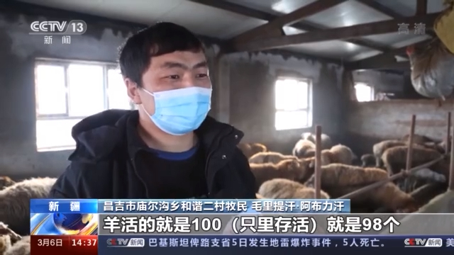昌吉市廟爾溝鄉(xiāng)和諧二村牧民 毛里提汗·阿布力汗:外面天冷的時(shí)候,我們把羊娃抱過(guò)來(lái)(在圈里過(guò)夜)。我們這個(gè)羊活的就是100(只里存活)就是98個(gè)。
