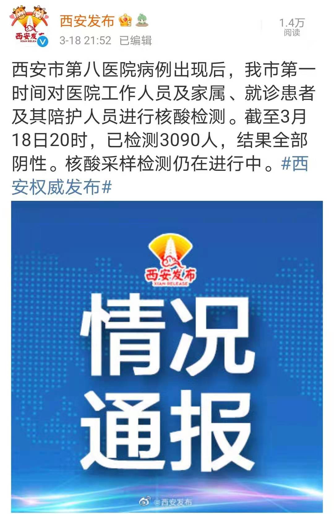 據(jù)“西安發(fā)布”微博消息,西安市第八醫(yī)院出現(xiàn)新冠肺炎確診病例后,西安市第一時間對醫(yī)院工作人員及家屬、就診患者及其陪護人員進行核酸檢測。截至3月18日20時,已檢測3090人,結(jié)果全部陰性。核酸采樣檢測仍在進行中。