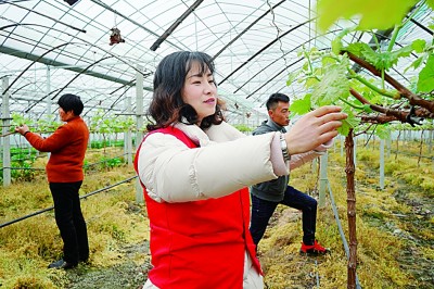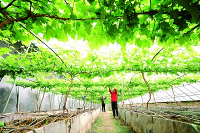 農(nóng)戶(hù)在河北省巨鹿縣西郭城鎮(zhèn)南鹽池村果蔬大棚管護(hù)葡萄。胡良川攝/光明圖片