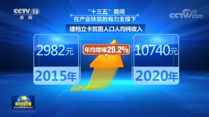 “十三五”期間,在產(chǎn)業(yè)扶貧的有力支撐下,建檔立卡貧困人口人均純收入由2015年的2982元,增加到2020年的10740元,年均增幅29.2%。