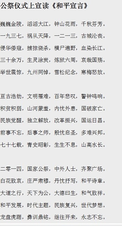 上午10時,南京大屠殺死難者國家公祭儀式開始。77名南京市青少年代表宣讀《和平宣言》。77名青少年寓意南京大屠殺慘案發(fā)生77周年!逗推叫浴纷髡呤悄暇┦形穆(lián)顧問馮亦同。