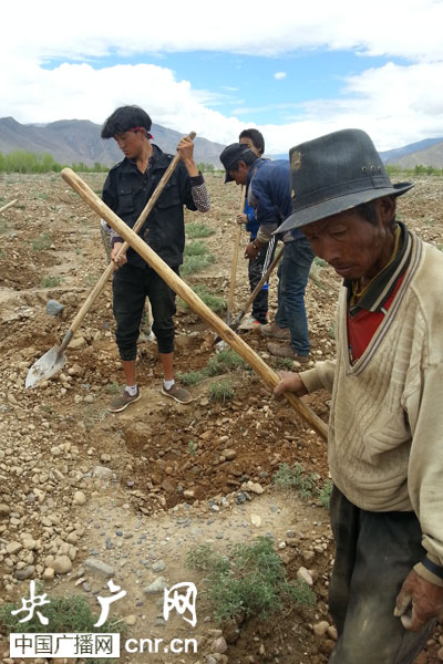 央廣網(wǎng)日喀則7月28日消息(記者劉飛 普布次仁)在西藏雅魯藏布江北岸,柳果村村民米瑪正在種植沙棘,一鐵鍬下去,幾乎沒有碰到土,而全是鵝卵石,發(fā)出乒乓的響聲。他說(shuō),這里常年風(fēng)沙大,沙子一直吹到村子里。