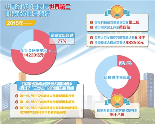 國際科技論文數(shù)量穩(wěn)居世界第二位,被引用次數(shù)從2010年的第八位攀升至2015年的第四位,國內(nèi)專利申請量和授權(quán)量已居世界第一和第二。