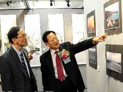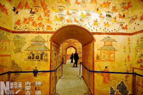 4月16日,參觀者在觀看和林格爾小板申東漢壁畫墓的復(fù)原壁畫