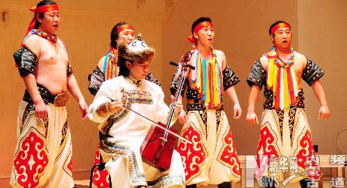 11月8日,在英國首都倫敦市中心的卡多根劇場,中國內(nèi)蒙古民族歌舞劇團(tuán)青年合唱團(tuán)演員為觀眾表演傳統(tǒng)節(jié)目。當(dāng)天,30名合唱團(tuán)演員深情演繹了蒙古族民歌《圣主成吉思汗》、《四!贰ⅰ堆恪、《駝鈴》和《蒙古靴》等作品。長調(diào)、馬頭琴和呼麥號稱蒙古族音樂的三大特色,其中前兩者已被聯(lián)合國教科文組織列為人類非物質(zhì)文化遺產(chǎn),這些在當(dāng)晚的演出中一一得到展現(xiàn)。 新華社記者馬建國攝