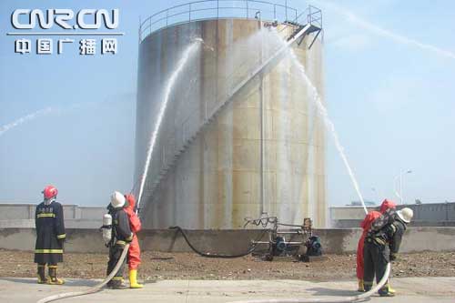 消防官兵對(duì)泄露灌體進(jìn)行澆水冷卻