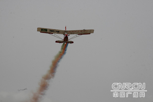 中廣網(wǎng)呼和浩特5月3日消息(記者鄭穎 攝影馬立峰)祝福北京、喝彩奧運,奧運火炬手諾敏·何自駕飛機航拍內(nèi)蒙古起飛儀式今天下午兩點左右在和林格爾航空俱樂部舉行。起飛儀式上,諾敏·何身著蒙古族盛裝自駕飛機在空中進行了航拍表演,用特別的方式表達一位蒙古族奧運火炬手的奧運情懷,寄托對北京奧運會的祝福。