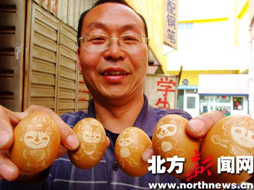 中廣網(wǎng)呼和浩特5月6日消息 內(nèi)蒙古包頭市蛋雕愛(ài)好者李廣晨展示蛋雕福娃。李廣晨從2005年開(kāi)始從事蛋雕創(chuàng)作,內(nèi)容涵蓋人物、肖像、生肖等。今年是奧運(yùn)年,李廣晨利用業(yè)余時(shí)間創(chuàng)作了奧運(yùn)福娃蛋雕作品,表達(dá)對(duì)2008北京奧運(yùn)會(huì)的祝福。(李強(qiáng))