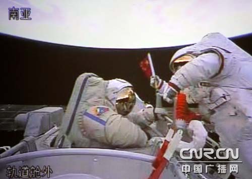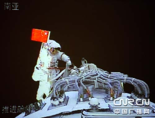 航天員翟志剛揮動著五星紅旗漂浮在太空。(中廣網(wǎng)記者南光 曹囡囡攝)