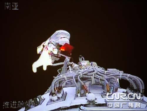 艙外航天員身上的安全掛鉤將航天員與神七飛船緊密相連。(中廣網(wǎng)記者南光 曹囡囡攝)