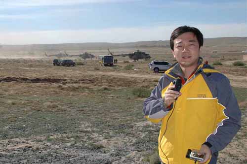 記者王亮在著陸場報道直升機分隊進行搜救演練