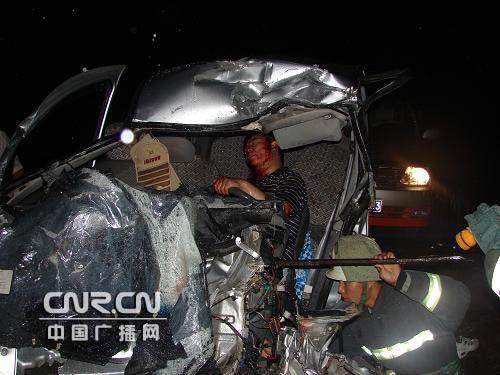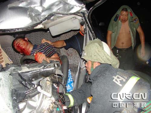 中廣網(wǎng)呼和浩特8月24日消息 (記者阿都?xì)J、通訊員王保國)8月23日20時(shí)50分,內(nèi)蒙古呼倫貝爾阿榮旗消防大隊(duì)接到報(bào)警:301國道霍爾奇鎮(zhèn)段兩車相撞,發(fā)生嚴(yán)重車禍,車內(nèi)有人被困,請快來救人!