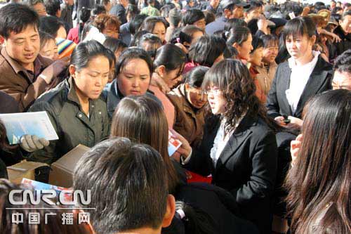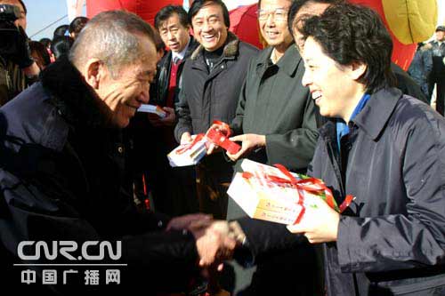 內(nèi)蒙古黨委宣傳部部長(zhǎng)烏蘭向群眾贈(zèng)送十七大圖書(馬立峰 攝)