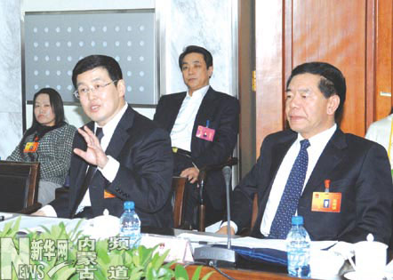 1月20日下午,自治區(qū)黨委副書記巴特爾(左)與出席自治區(qū)十一屆人大一次會議的包頭市代表審議政府工作報告。袁永紅攝
