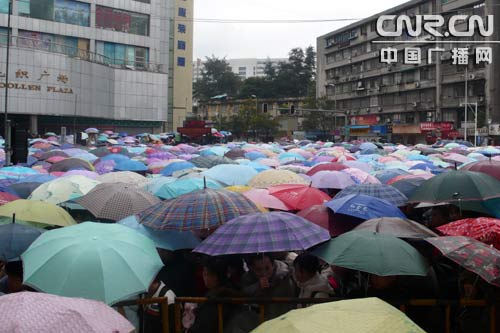 近日廣州市區(qū)普降中雨,旅客冒雨候車
