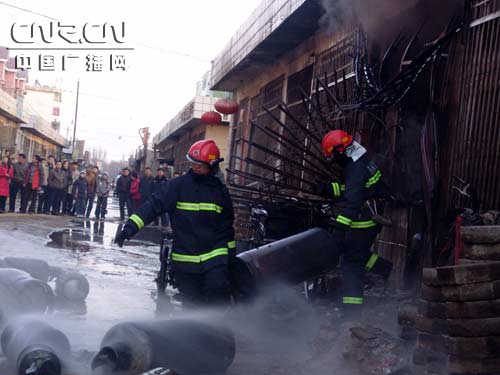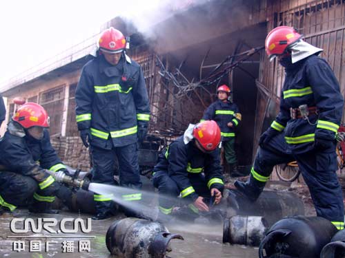 經(jīng)現(xiàn)場勘察后,指揮員果斷決定將官兵分成兩個小組展開戰(zhàn)斗,第一小組設(shè)立警戒區(qū),防止圍觀群眾進(jìn)入現(xiàn)場;同時用稀釋空氣中的液化氣體,防止液化氣向周圍居民區(qū)擴散;第二小組撲救液化氣站內(nèi)火災(zāi)。兩個戰(zhàn)斗小組接到命令后迅速行動,第一戰(zhàn)斗小組利用開花水槍稀釋空氣中不斷向居民區(qū)蔓延的液化氣體。為預(yù)防再次發(fā)生爆炸事故,第二戰(zhàn)斗小組爬上了液化氣站對面房頂占據(jù)有利位置射水撲救火災(zāi)。經(jīng)過大約20分鐘的戰(zhàn)斗,大火被基本撲滅。在水槍的掩護下,消防官兵奮不顧身地沖進(jìn)房屋內(nèi),冒著隨時可能發(fā)生爆炸的危險,將熱得發(fā)燙的液化氣罐搬出。隨后,官兵們用水槍繼續(xù)對罐體射水冷卻,防止發(fā)生爆炸。在搬運液化氣罐的時候,官兵們發(fā)現(xiàn)還有一個液化氣罐在不停的泄露,由于罐體抓手部分變形積壓住閥門部分,給官兵們處置帶來較大的困難。在水槍的稀釋下,官兵們用鉗子將閥門擰死,止住了氣體的泄露。經(jīng)過1個多小時的奮戰(zhàn),官兵們終于將此次事故成功處置,避免了造成更大的事故。