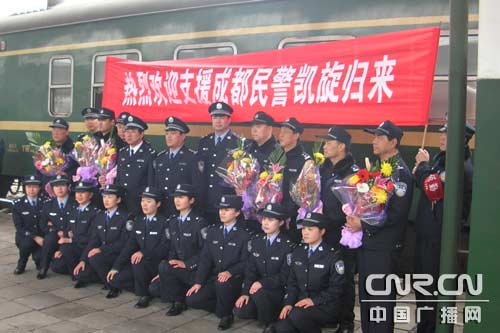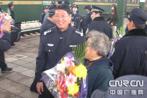 中廣網(wǎng)呼和浩特3月10日消息(記者鄭穎 通訊員張強(qiáng)、崔玉平)2008年3月9日11時(shí)30分,隨著載著呼鐵公安局包頭公安處支援成都春運(yùn)工作民警的1718次列車?吭诎^東站,一剎那,鮮花和榮譽(yù)屬于這些凱旋歸來的鐵警英雄們,包頭鐵路公安處領(lǐng)導(dǎo)帶隊(duì)來車站迎接他們的歸來,標(biāo)志著支援成都春運(yùn)工作一個(gè)多月的包頭鐵路公安處20名民警圓滿完成工作任務(wù),凱旋歸來。