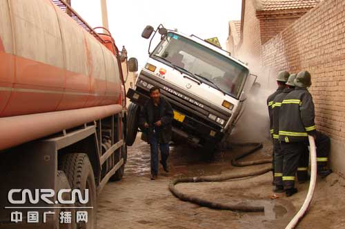 中廣網(wǎng)呼和浩特4月5日消息(記者鄭穎 通訊員仲高錦)4月3日15時32分內(nèi)蒙古阿拉善盟阿左旗消防中隊接到報警,巴彥浩特鎮(zhèn)民族中學(xué)家屬區(qū)一油罐車傾翻,發(fā)生嚴重泄漏,車內(nèi)載有5噸90﹟汽油,時刻有發(fā)生爆炸的危險,嚴重影響到周圍幾百戶居民的生命財產(chǎn)安全。接到報警,阿左旗中隊迅速出動1輛泡沫車、1輛水罐車、1輛后援車,14名官兵在5分鐘內(nèi)趕到現(xiàn)場,并立刻展開戰(zhàn)斗。