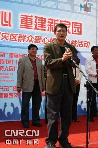中廣網(wǎng)呼和浩特5月16日消息(記者陳青平、文偉)5月16日上午10:00,由中央人民廣播電臺內蒙古記者站、呼和浩特市紅十字會、呼和浩特人民廣播電臺共同發(fā)起的“攜手獻愛心 重建新家園”——關愛四川災區(qū)群眾愛心捐贈公益活動在呼和浩特市新華廣場舉行。截至記者發(fā)稿,共籌得善款432920.9元。其中中國移動呼和浩特分公司捐款10萬元。