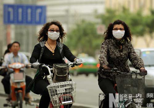 5月28日,呼和浩特市民在大風(fēng)沙塵中騎車行進(jìn)。新華社記者張領(lǐng)攝