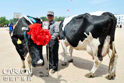 是誰把這么多的奶牛牽到運動場上來了,怎么奶牛也都掛上了號牌子,它們也要參加比賽嗎?噢,不是!這些奶牛是參加選美來了,你看那些評委可都是扎蘭屯農(nóng)牧局、內(nèi)蒙古農(nóng)牧學校的專家啊,別小瞧這些黑白花大奶牛,這可是咱們農(nóng)民兄弟的小銀行!看,那獲得冠軍的大奶牛嘴里美滋滋地嚼什么呢,那高興壞了的主人手里拿的可是他心愛的奶牛剛剛得到的三千元獎金?嘴都合不上了,回家可要好好犒賞犒賞有功之牛喲……