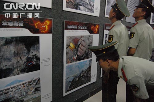 年輕戰(zhàn)士仔細(xì)觀看圖片 “抗震救災(zāi) 眾志成城—2008中國抗震救災(zāi)大型新聞圖片展”精選了新華社記者在抗震救災(zāi)一線拍攝的近300幅圖片和自治區(qū)新聞工作者在抗震救災(zāi)一線及救援后方的拍攝的40余幅圖片。展出的圖片極具震憾力,是從近10萬張抗震救災(zāi)圖片中精選出來的。展覽分“關(guān)懷”“災(zāi)情”“營救”“援助”和“恢復(fù)”五個(gè)專題。