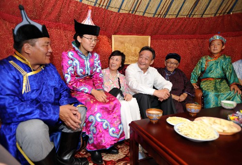 7月7日至10日,中共中央政治局常委、全國(guó)人大常委會(huì)委員長(zhǎng)吳邦國(guó)在內(nèi)蒙古自治區(qū)考察工作。這是7月8日,吳邦國(guó)看望呼倫貝爾市陳巴爾虎旗烏珠爾蘇木額爾敦嘎查圖門德力格爾(左)一家。 新華社記者 高潔 攝
