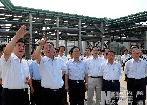 7月7日至10日,中共中央政治局常委、全國(guó)人大常委會(huì)委員長(zhǎng)吳邦國(guó)在內(nèi)蒙古自治區(qū)考察工作。這是7月10日,吳邦國(guó)視察億利資源集團(tuán)公司重化工循環(huán)經(jīng)濟(jì)產(chǎn)業(yè)園區(qū)。 新華社記者 高潔 攝