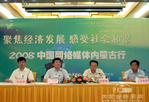 | 中廣網呼和浩特9月4日消息 2008年9月3日,由國務院新聞辦網絡局指導,內蒙古自治區(qū)黨委宣傳部、自治區(qū)黨委外宣辦、自治區(qū)經濟委員會、自治區(qū)旅游局主辦,內蒙古互聯(lián)網新聞中心、呼和浩特市市委宣傳部、鄂爾多斯市市委宣傳部、烏海市市委宣傳部承辦的“聚焦經濟發(fā)展感受社會和諧”第三屆中國網絡媒體內蒙古行大型宣傳采訪活動在呼和浩特正式啟動,來自全國各地的近40家網絡媒體編輯記者齊聚首府,將對內蒙古進行全面報道,采訪團成員將深入呼和浩特市、鄂爾多斯市、烏海市,對三市的三大產業(yè)進行深入采訪,著重報道改革開發(fā)30年來內蒙古經濟社會各領域取得的累累碩果,感受改革開放30年來內蒙古經濟快速發(fā)展給內蒙古人民帶來的福祉,感受和諧社會里人民安居樂業(yè),生活欣欣向榮的美好景象。