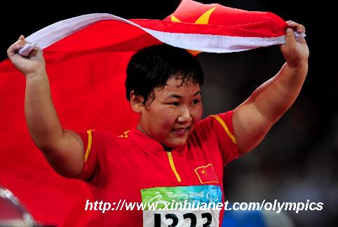 9月13日,在國家體育場進行的北京2008年殘奧會女子鐵餅F40級決賽中,孟根吉米素以28米04的成績奪冠,并打破世界紀錄。 蒙古族姑娘孟根吉米素的奪冠讓人感到欽佩。年僅17歲的孟根吉米素天生患有生長激素缺乏癥。出生沒多久媽媽就出走了,由于爸爸常年在外打工,家里只有奶奶一個親人,小小的她從幼年時便分擔起家里的活計,生活的磨礪得到了造就了她堅韌的性格,所以我們向她送去了鮮花。