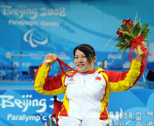 9月13日,中國選手邊建欣在頒獎儀式上。 當日,在北京2008年殘奧會女子60公斤級舉重比賽中,邊建欣兩次打破世界紀錄,最終以135公斤的成績奪得冠軍。 新華社記者楊磊攝