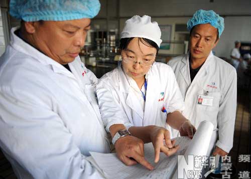 9月19日,呼和浩特市質(zhì)量技術(shù)監(jiān)督局經(jīng)濟(jì)技術(shù)開(kāi)發(fā)區(qū)分局的兩名工作人員(左、右)在伊利金川奶粉生產(chǎn)廠查看半成品檢驗(yàn)報(bào)告單。 從9月17日開(kāi)始,內(nèi)蒙古自治區(qū)派出質(zhì)檢部門工作人員,進(jìn)駐乳制品生產(chǎn)企業(yè)伊利、蒙牛,對(duì)企業(yè)每一批次的原奶和產(chǎn)品進(jìn)行嚴(yán)格監(jiān)控,確保產(chǎn)品質(zhì)量。 新華社記者 任軍川 攝