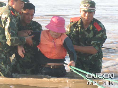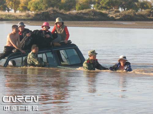 當(dāng)日16時36分,額濟納旗邊防大隊接到報警稱:一輛越野車在距達來庫布鎮(zhèn)西南方向20公里的漫水橋被河水沖下橋面,車內(nèi)5人被困,情況危急,請求救援。接警后,邊防大隊立即啟動處置突發(fā)事件預(yù)案,11名官兵攜帶繩索、鐵鍬等救援工具,兵分兩路火速趕赴漫水橋。事發(fā)現(xiàn)場,百余名游客及過往群眾站在河水兩岸焦急而又無奈地向河中心張望、呼喊。一輛越野車被湍急的河水沖下橋面,距河岸150多米遠(yuǎn),河水已漫至車窗上沿,5名乘客坐在越野車頂部瑟瑟發(fā)抖,等待救援。由于近日額濟納旗境內(nèi)降雨量增大,漫水橋河面水位暴漲,水流湍急,越野車隨著水浪左右搖擺,隨時有被掀翻的危險,5名游客的生命岌岌可危。救援人員兵分兩組,身材較為高大的一組將繩索系住腰部,手挽手下河救援;另一組緊緊拉住繩索,確保救援官兵和被救群眾的安全。由于驚嚇過度兩名女游客,蜷縮在越野車頂部,驚恐地看著河水,不肯配合救援。經(jīng)過救助官兵在冰冷的河水中耐心勸導(dǎo),兩名女游客最終才接受救助。經(jīng)過一個小時的緊急救援,5名被困人員在河水漫過車頂之前全部被安全救出。經(jīng)了解,5名受困人員中4名是來額濟納旗旅游的韓國人,駕駛員系呼和浩特市某旅游局職工。5人在怪樹林拍照返回途中,由于駕駛員對漫水橋面情況不熟悉、對水勢估計不足,導(dǎo)致車輛被河水沖下橋面,險些釀成車毀人亡的慘劇。