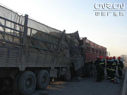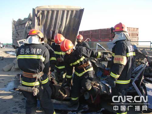 包頭消防支隊接到報警后,派出8名特勤官兵和一輛多功能救援車于7:32到達事故現(xiàn)場,采取交通限行、緊急搶救等措施,將追尾的兩輛貨車分開。但由于追尾車輛車廂嚴重受損變形,導致5名駕乘人員全部當場死亡。