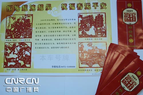 中廣網(wǎng)呼和浩特1月19日消息(記者鄭穎 通訊員單煒、姜雅靜)自1月11日2009年春運開始,在包頭市的各長途客運站的駕駛人和等候乘車回家過年的乘客們都收到了一份特殊的禮物——“紅包”,這是包頭市公安局交警支隊自行制作的2009年春運交通安全宣傳品。這份宣傳品與往年不同,選用了節(jié)日期間人們常用的“紅包”,“紅包”的封皮上運用了以警民和諧為主題的剪紙作品,一句“平安是福”更是道出了春運交通安全的主題。不過與傳統(tǒng)“紅包”有所不同的是,這個“紅包”里裝的不是金錢,而是“平安”,是包頭市交警支隊寫給每一位機動車駕駛人和乘客的一封信,讓廣大交通參與者在接受交通安全教育的同時,也接受了“順利啟程、平安歸來”的美好祝愿。拿到“紅包”后,客運車駕駛人和乘客們的臉上都洋溢著幸福的歡笑,他們高興地說:“的確是這樣,對于我們出門在外的人來說,能平安回家那就是最大的福氣!