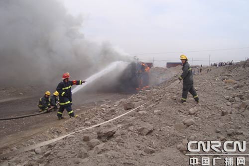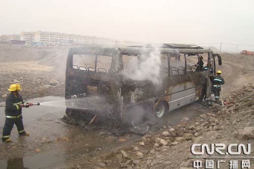 接到報(bào)警后,支隊(duì)當(dāng)日值班指揮長(zhǎng)迅速指派轄區(qū)消防一中隊(duì)出動(dòng)兩輛大噸位水罐車20名消防員前往火災(zāi)地點(diǎn)。消防官兵到達(dá)現(xiàn)場(chǎng)后,發(fā)現(xiàn)一輛車牌號(hào)為蒙M07468的大客車處于猛烈燃燒階段,在詢問得知沒有人員被困后,消防中隊(duì)指揮員果斷下令,出2支水槍進(jìn)行滅火,一支水槍負(fù)責(zé)對(duì)準(zhǔn)該車起火部位右后側(cè)尾部出水,另一支水槍冷卻油箱,由于出動(dòng)及時(shí),戰(zhàn)術(shù)運(yùn)用恰當(dāng),整個(gè)滅火戰(zhàn)斗15分鐘結(jié)束,成功保護(hù)住了車輛前端部分,最大限度的挽救了財(cái)產(chǎn)。