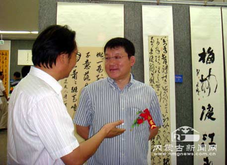 內(nèi)蒙古自治區(qū)黨委宣傳部常務(wù)副部長畢力夫(右一)與自治區(qū)書法家協(xié)會主席何奇耶徒交流。