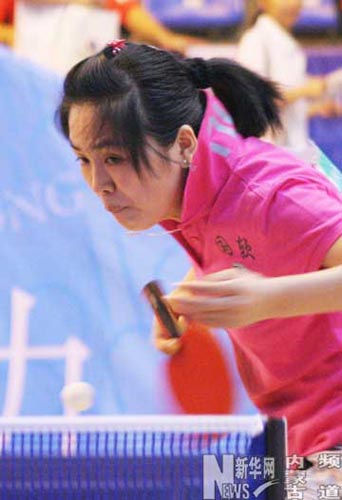 7月29日,武漢大學(xué)代表隊(duì)的苗文靜在第十五屆全國(guó)大學(xué)生乒乓球錦標(biāo)賽單打比賽中發(fā)球。