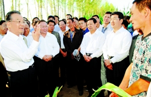 8月28日,中共中央政治局常委、國務(wù)院總理溫家寶深入通遼市奈曼旗義隆永鎮(zhèn)小東溝村田間察看旱情,與當?shù)剞r(nóng)民親切交談,了解受旱情況。 記者 馬建斌 攝