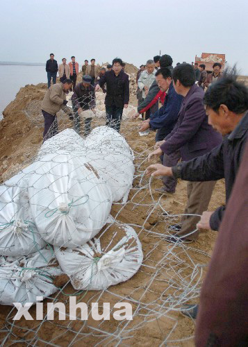 3月22日,搶險(xiǎn)人員正在加厚發(fā)生險(xiǎn)情的黃河堤壩。3月21日下午,黃河內(nèi)蒙古準(zhǔn)格爾旗李三壕河段出現(xiàn)流凌淘岸險(xiǎn)情。當(dāng)?shù)胤姥床块T動(dòng)用260多人和140余輛汽車、工程車日夜搶險(xiǎn)。目前淘岸險(xiǎn)情得到初步控制。 新華社記者 任軍川攝