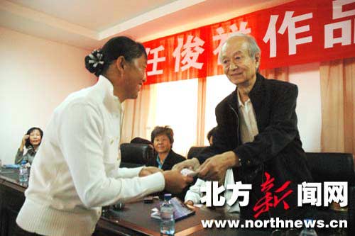 內(nèi)蒙古師范大學(xué)教授李淑章將2000元錢交給鄂爾多斯市烏審旗農(nóng)民任俊祥,贊助她出版詩(shī)集。 (攝影 王磊)