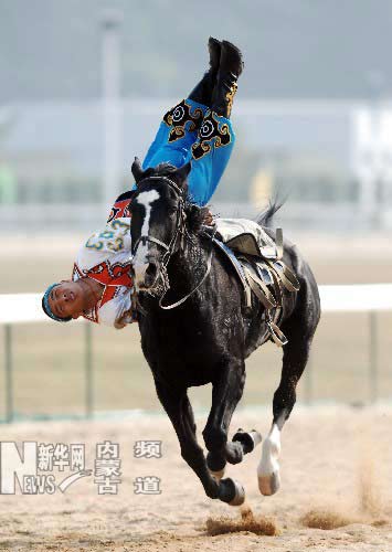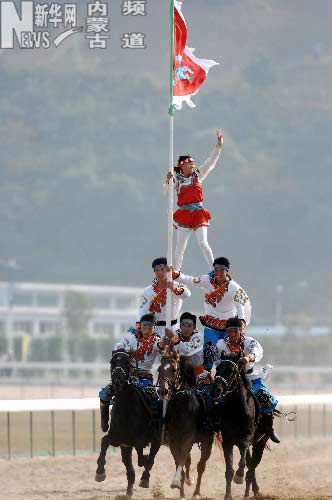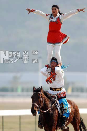 11月11日,內(nèi)蒙古馬術(shù)隊(duì)隊(duì)員在進(jìn)行表演。當(dāng)日,第八屆全國(guó)少數(shù)民族傳統(tǒng)體育運(yùn)動(dòng)會(huì)馬術(shù)表演在廣州馬術(shù)場(chǎng)舉行。 新華社記者沈橋攝