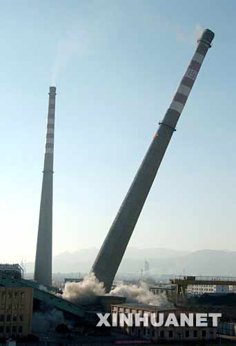 11月29日,呼和浩特熱電廠的一座小火電煙囪被成功爆破拆除。 新華社記者任軍川攝