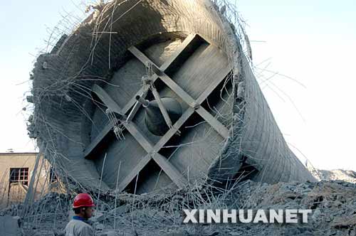 一名工作人員從被爆破的煙囪旁邊走過。新華社記者任軍川攝