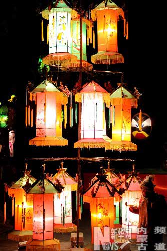 元宵節(jié)前夕,呼和浩特市五塔寺各色各樣俏麗的花燈流光溢彩,吸引了大量市民觀看。(任軍川)