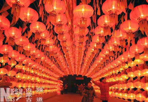 2月20日,兩名小朋友在呼和浩特市五塔寺花燈走廊里面玩耍