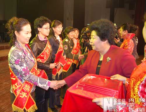 3月6日下午,由內(nèi)蒙古自治區(qū)婦聯(lián)主辦的紀(jì)念“三八”國際勞動婦女節(jié)表彰大會暨文藝演出在內(nèi)蒙古人民會堂舉行。26名個人榮獲“全國三八紅旗手”榮譽稱號,22個單位榮獲“全國三八紅旗集體”榮譽稱號;100名個人榮獲“自治區(qū)三八紅旗手”榮譽稱號,50個單位榮獲“自治區(qū)三八紅旗集體”榮譽稱號。圖為自治區(qū)政協(xié)副主席娜仁為受表彰的個人頒獎。