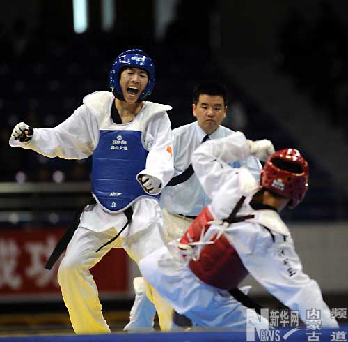 3月17日,在全國跆拳道錦標(biāo)賽暨第二十九屆奧運(yùn)會選拔賽男子62公斤級決賽中,內(nèi)蒙古選手朱圣鵬(左)戰(zhàn)勝上海選手張璇璇,獲得冠軍。 新華社記者范長國攝