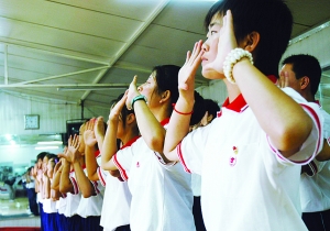 30張陽光般燦爛的笑臉,30雙有力的臂膀,30顆金子般的心靈,共同演繹《感恩的心》!氨砬椴粔蜃匀,動作不夠統(tǒng)一!敝笇(dǎo)老師康海琴對記者說。隨后,康海琴用手語將她的態(tài)度傳達給了30名聾啞學(xué)生。一遍又一遍,他們時而雙手環(huán)抱前胸,時而用手比劃成一個“心”,用心去詮釋這首歌曲。雖然不能說話,但他們齊刷刷地用手“舞”出這首歌曲時,是另外一種震撼。他們的節(jié)目將在火炬?zhèn)鬟f的終點進行演出。